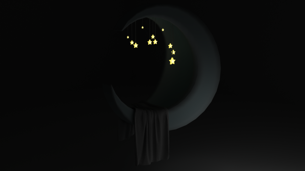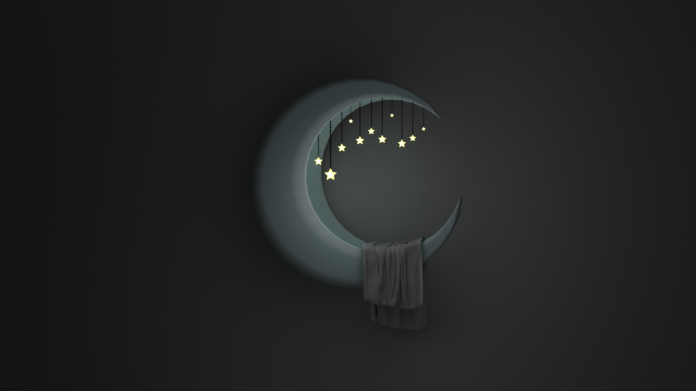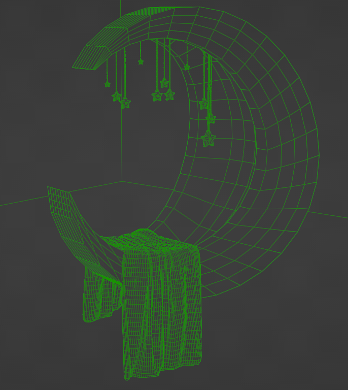 • 1 textured moon bed 3D model asset that has star lights and a blanket draped over it.