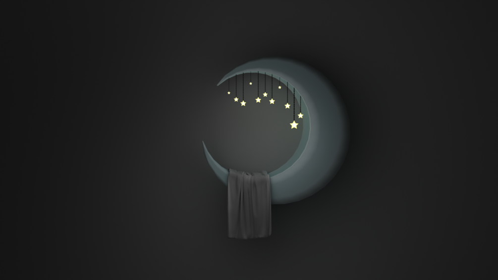- 1 textured moon bed 3D model asset that has star lights and a blanket draped over it.