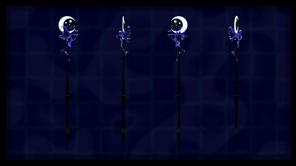 This is a moon themed staff designed for use with a VRChat avatar. The splashing water is a reference to how the moon influences the tide. The stars and splashing water is fully hidable by using shapekeys, to allow increased functionality and customizability.