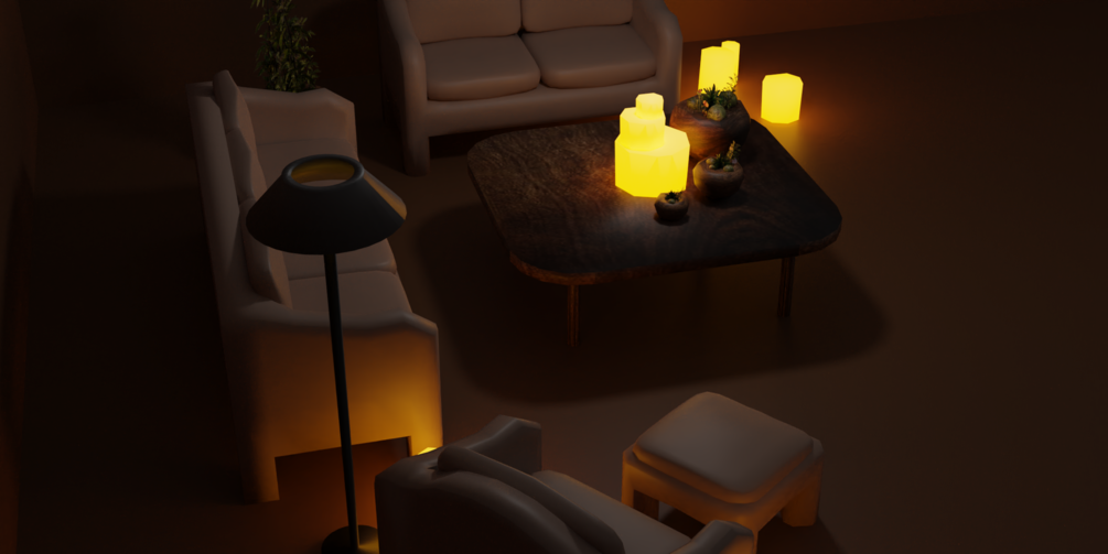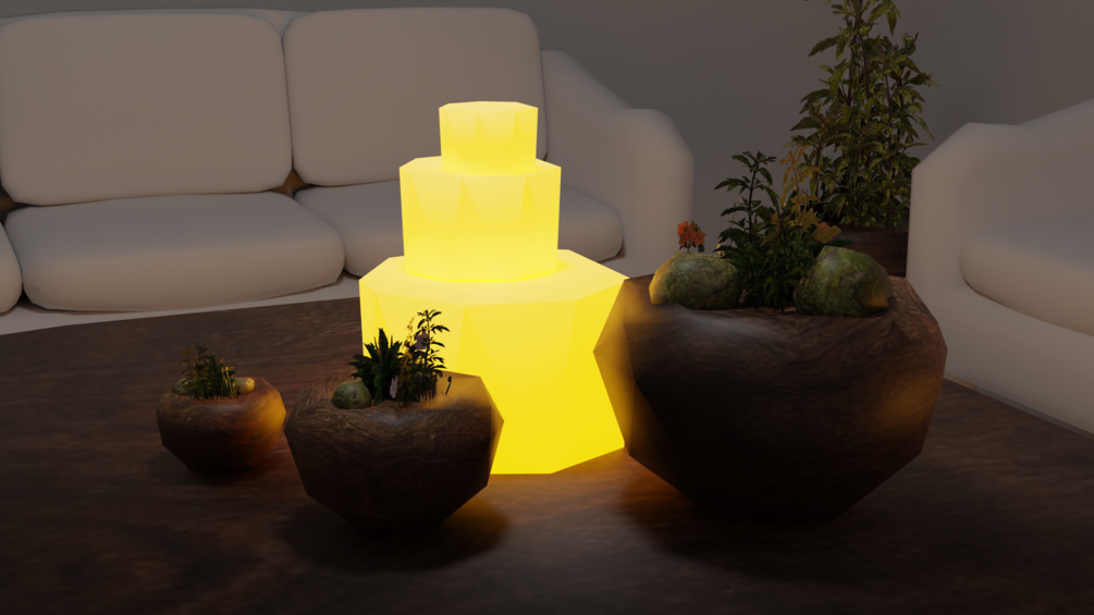 Neat little furniture set, with some potted plants and glowy lanterns. All objects can be moved or duplicated independently for customizing the layout, and the couches can be recolored to match your room theme. Take a look at this in my VRChat world Sleepy Moon Cabin and Rusty's Home and Avatars.